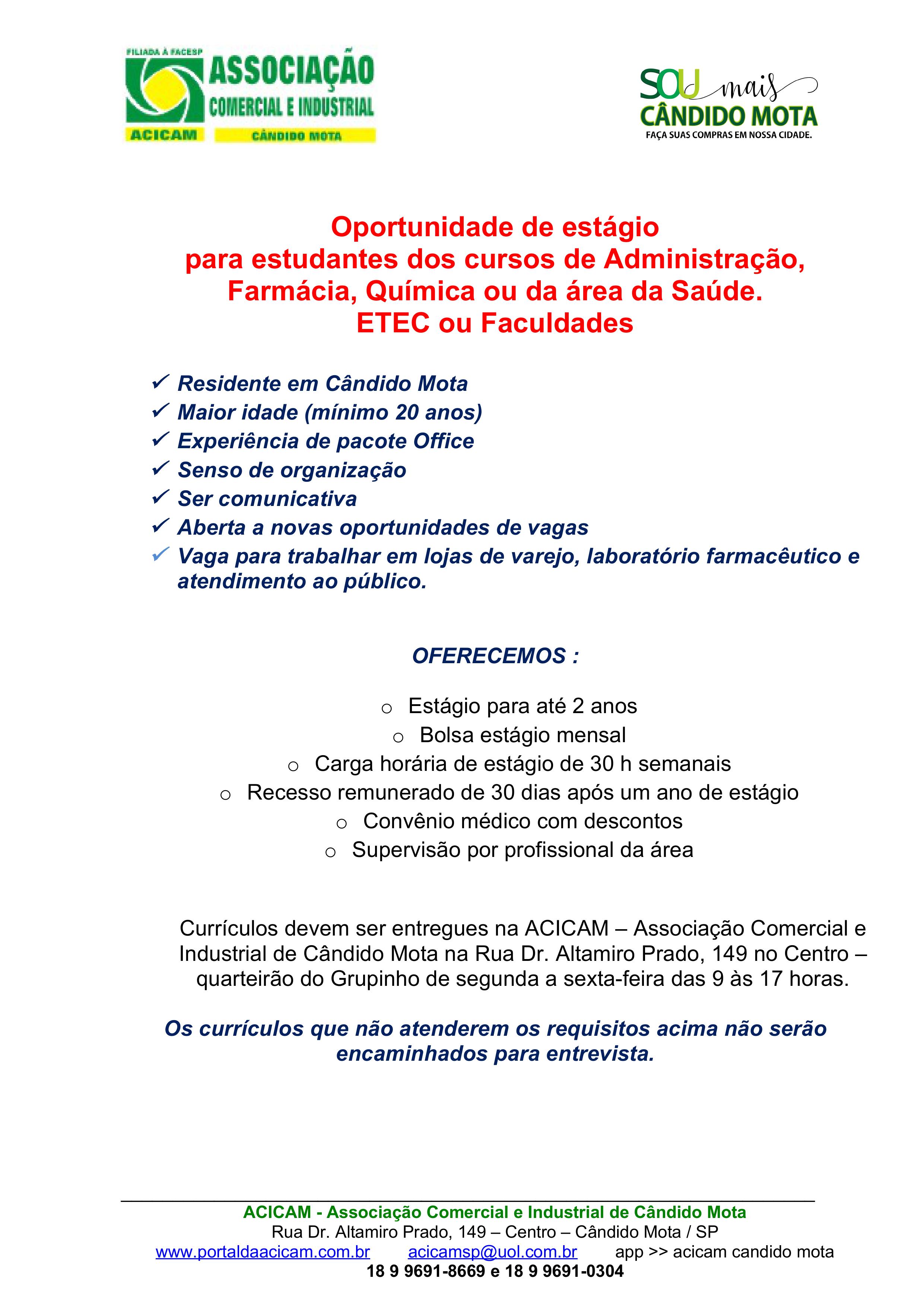 Currículos devem ser entregues na ACICAM – Associação Comercial e Industrial de Cândido Mota na Rua Dr. Altamiro Prado, 149 no Centro – quarteirão do Grupinho de segunda a sexta-feira das 9 às 17 horas ou cadastre-se pelo site.