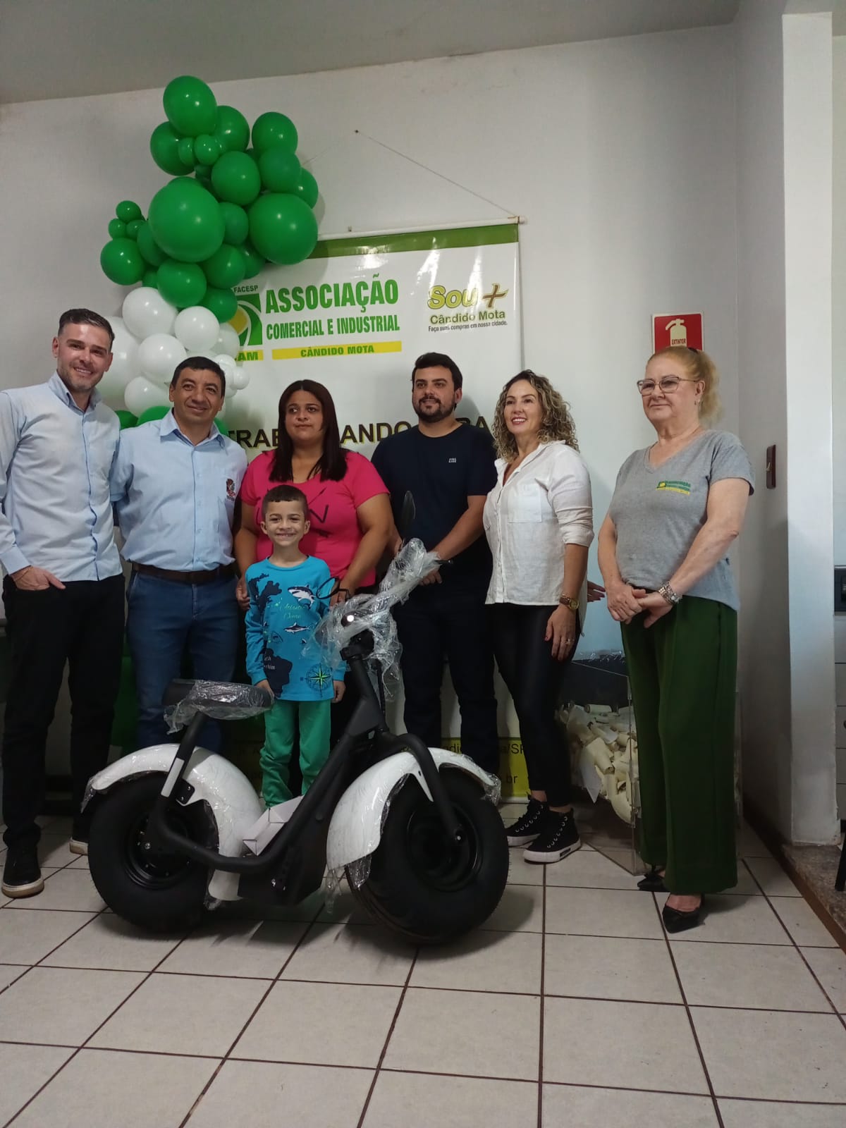 Na imagem, registramos a presença do Prefeito Eraldo, do Vice-Prefeito Julio Urbano, do vereador Churrão e de Sônia Pupim, presidente da ACICAM. Também estiveram presentes Caroline Nunes das Chagas, ganhadora da Scooter Elétrica, acompanhada da proprietária da loja Pura Belezza, Silvia.