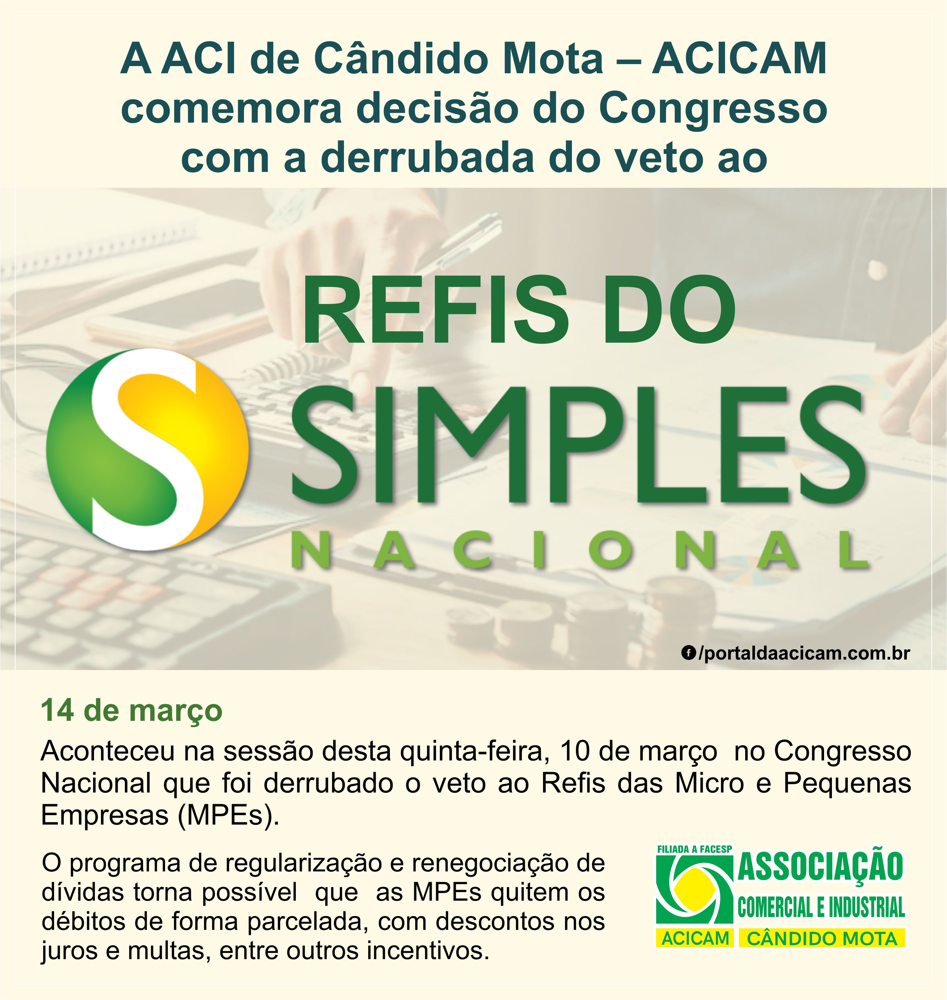 A ACI de Cândido Mota – ACICAM - se juntou às associações comerciais e assinaram abaixo assinado com este propósito juntamente com outras entidades que defendem as milhares de Micro e Pequenas Empresas que corriam risco de serem excluídas do Simples Nacional por não terem a chance de renegociar suas dívidas acumuladas no período de pandemia, e, assim sujeitas a fecharem suas portas o que geraria mais demissões de trabalhadores brasileiros.