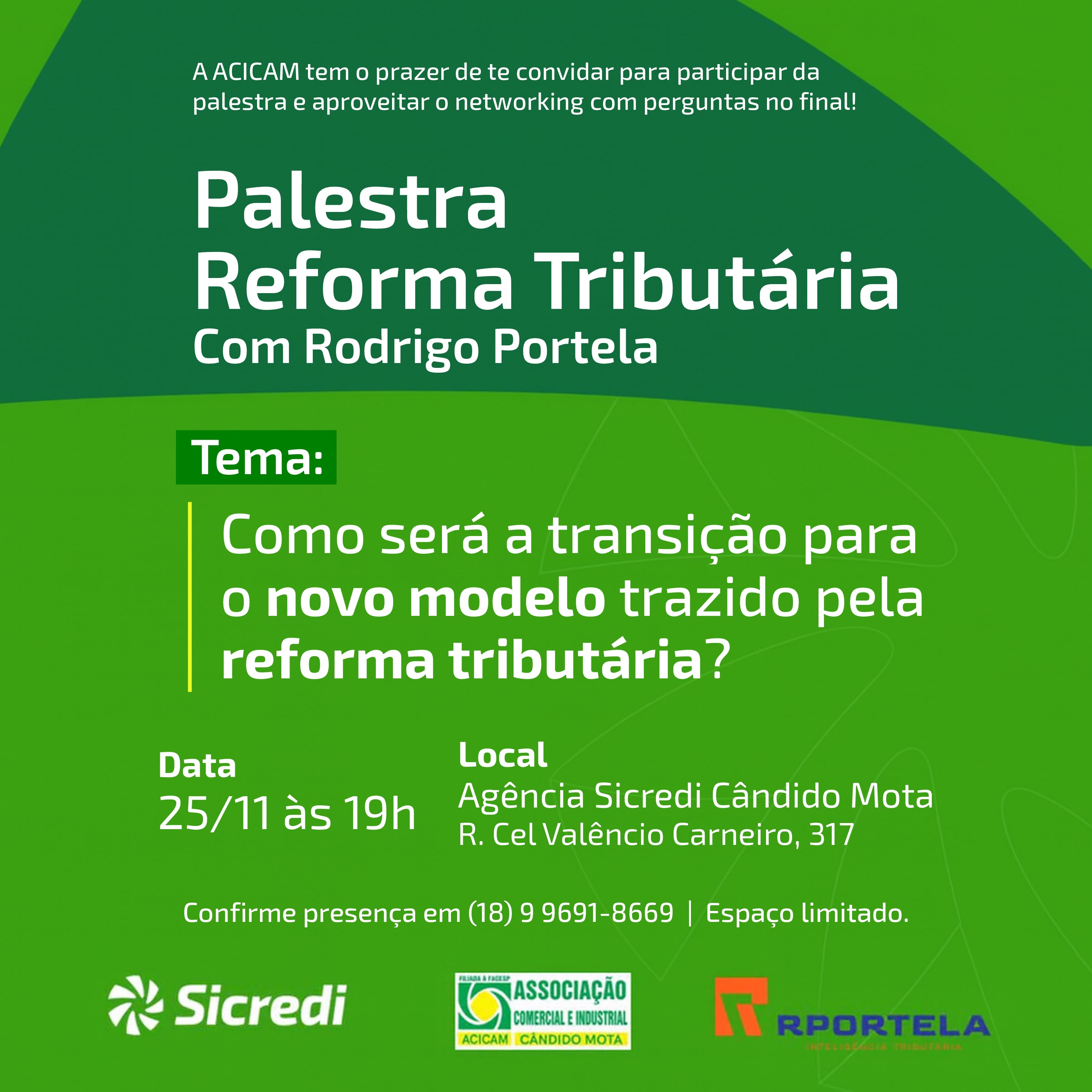 A ACICAM estará apoiando a palestra do advogado tributarista e Procurador do Município de Cândido Mota, Rodrigo Portela, que abordará as mudanças trazidas pela Reforma Tributária que já estão acontecendo.